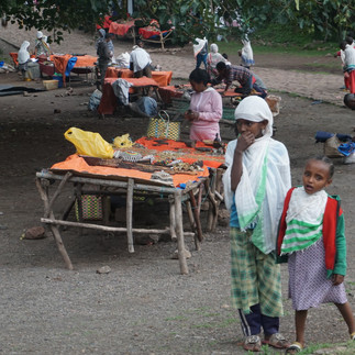 Na de laatste kerk lopen we naar een punt van waar je een fenomenaal uitzicht hebt over de omgeving. Je overziet het gebied en in de verte ligt ook de lokale markt. Patrick is opgehaald en sluit zich weer bij ons aan. De hele omgeving komt tezamen op deze zaterdagmarkt waar vooral veel ezels te zien zijn, honing, zaden, groenten, keukenspullen en traditionele kleding en sjaals worden verkocht. Overbodig te melden dat we hier natuurlijk ook weer behoorlijk opvallen.